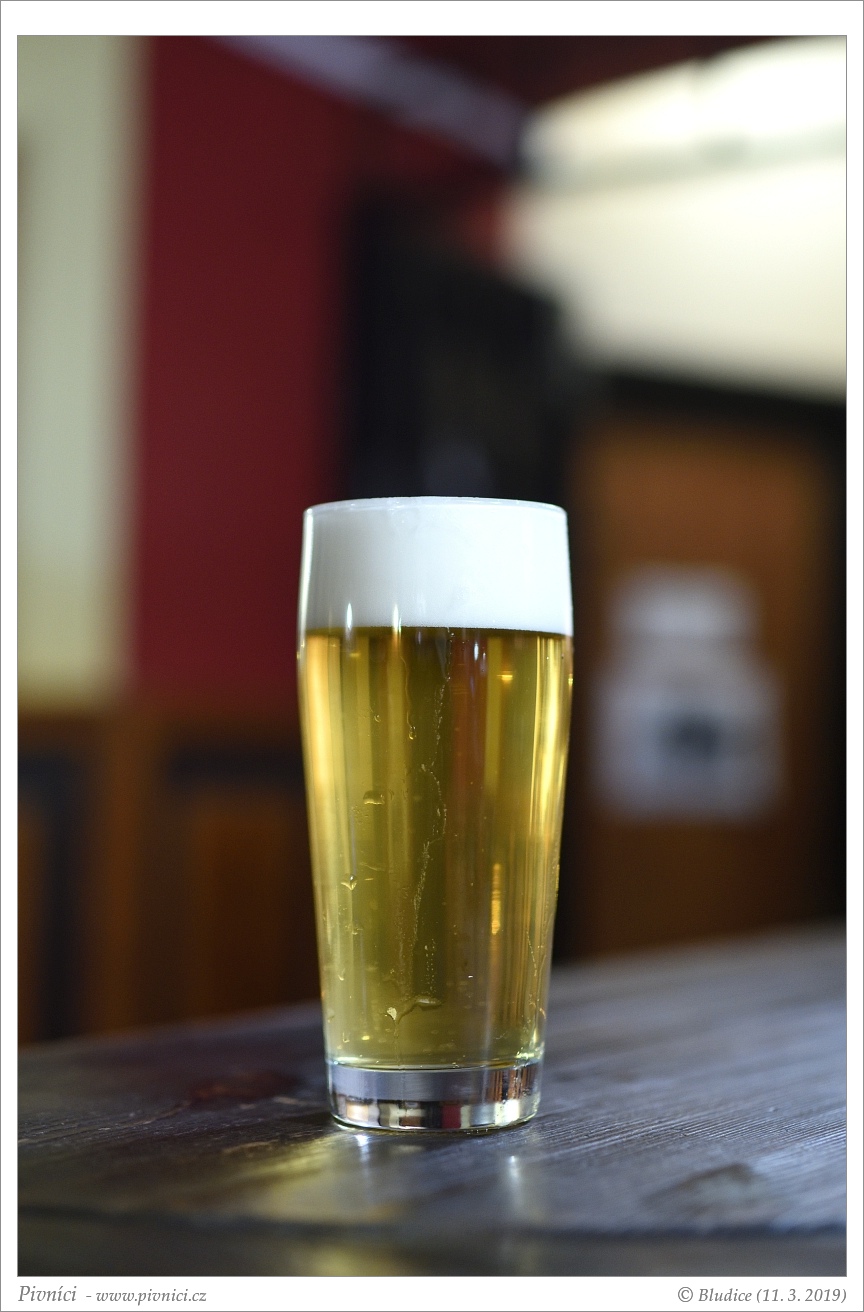 Zlatá barva, čiré. Pěkná světlá pěna, dobře drží.Vůně (1,5 - nedobré):