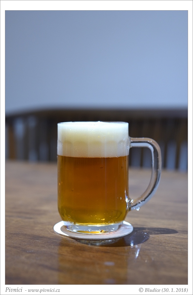 Zlatá barva, téměř čiré. Pěkná světlá pěna, dobře drží.Vůně (3,5 - velmi dobré):