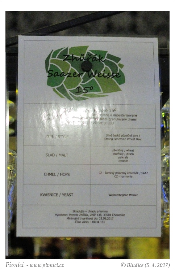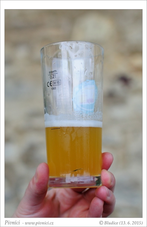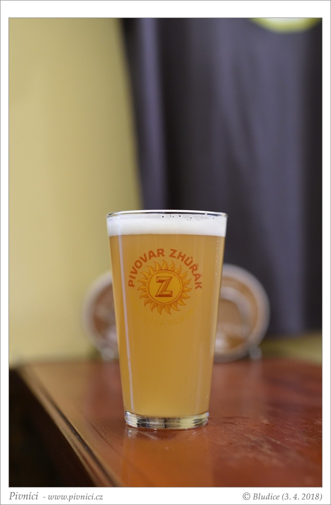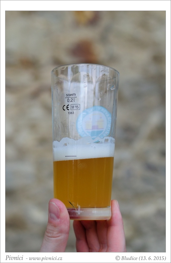 Světle zlatá barva, více zakalené. Pěkná světlá pěna, dobře drží.Vůně (3,5 - velmi dobré):
