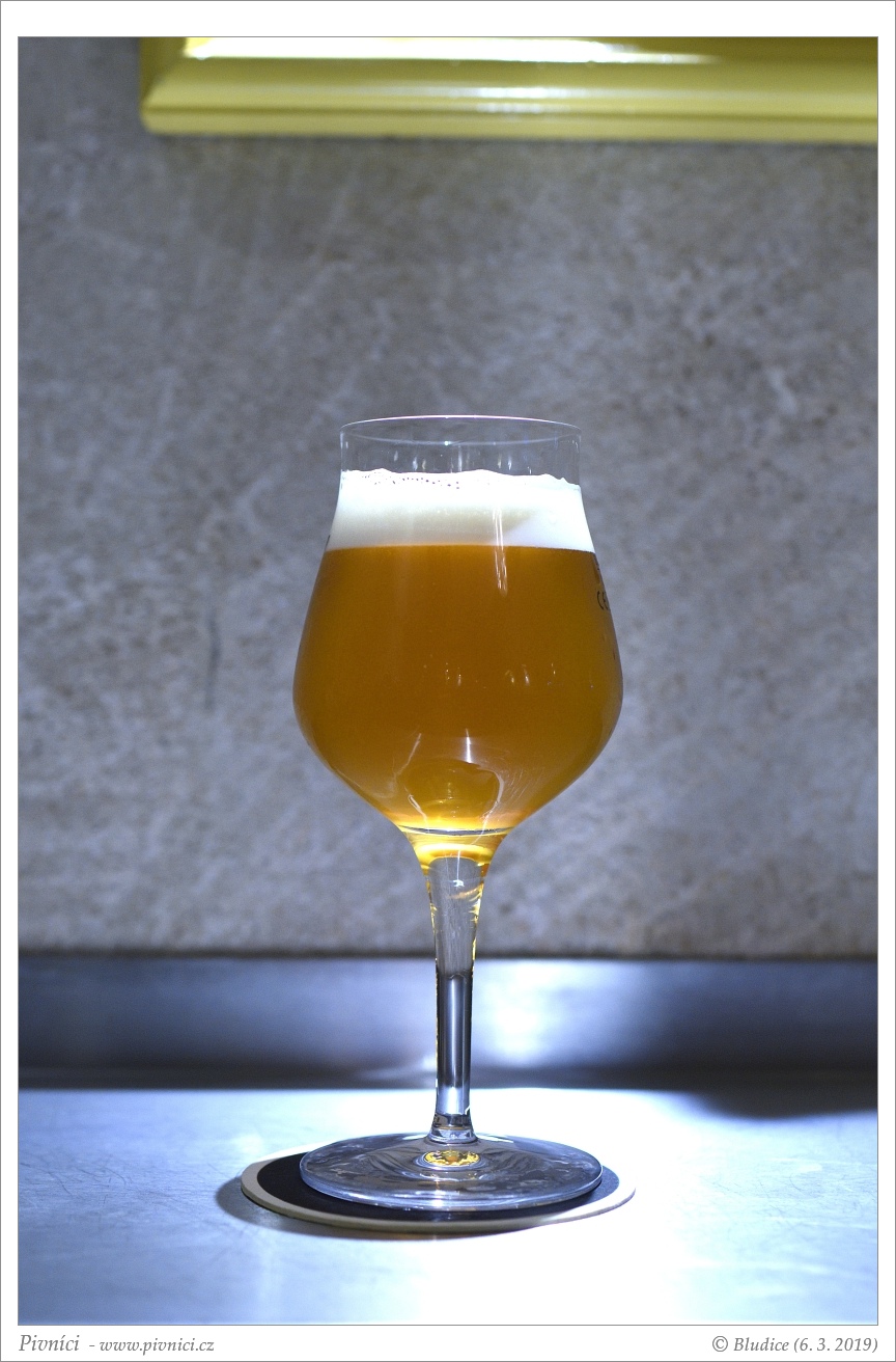 Tmavě zlatá barva, lehce zakalené. Pěkná světlá pěna, dobře drží.Vůně (3,5 - velmi dobré):