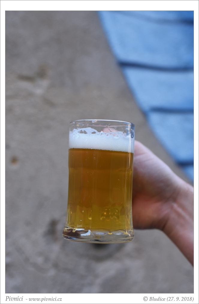 Zlatá barva, velmi lehce zakalené. Pěkná světlá pěna, dobře drží.Vůně (3,5 - velmi dobré):