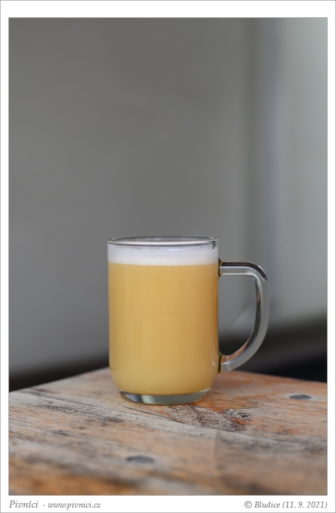 Slámová barva, velmi zakalené. Slušná světlá pěna, průměrně drží.Vůně (3 - dobré):