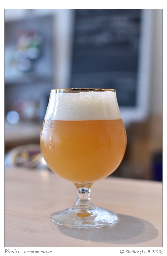 Zlatá barva, více zakalené. Pěkná světlá pěna, dobře drží.Vůně (3,5 - velmi dobré):