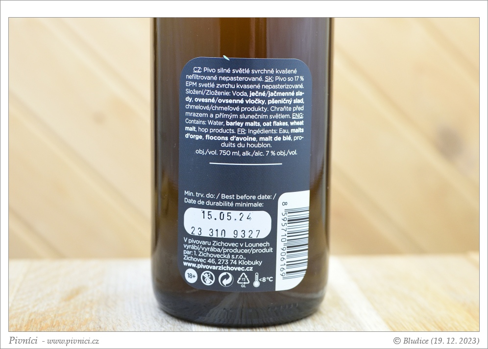 Světle zlatá barva, velmi zakalené. Pěkná světlá pěna, slušně drží.Vůně (3,5 - velmi dobré):