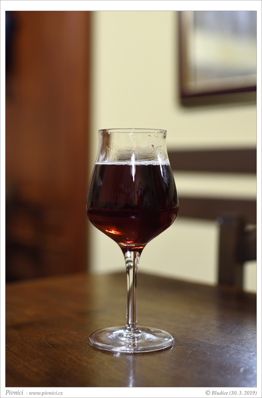 Mahagonová barva, čiré. Nízká světlá pěna, dobře drží.Vůně (4,5 - úchvatné):