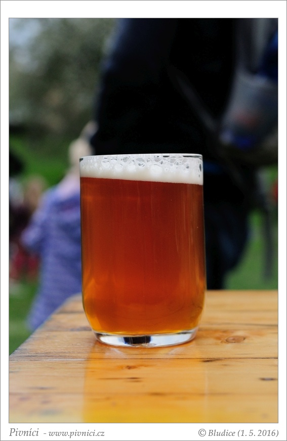Zlatá barva, lehce zakalené, slušná světlá pěna, dobře drží.Vůně (3,5 - velmi dobré):