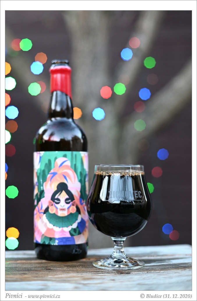 Barva téměř černá. Nízká pěna s většími bublinami.Vůně (3,5 - velmi dobré):