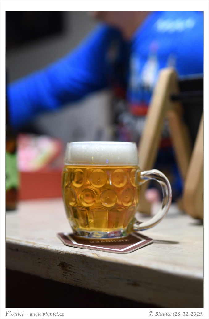 Zlatá barva, lehce zakalené. Pěkná světlá pěna, dobře drží.Vůně (3,5 - velmi dobré):