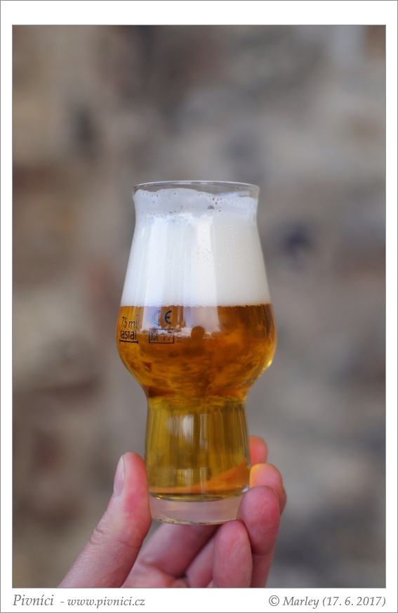 Zlatá barva, prakticky čiré, pěkná světlá pěna, dobře drží.Vůně (4 - výborné):
