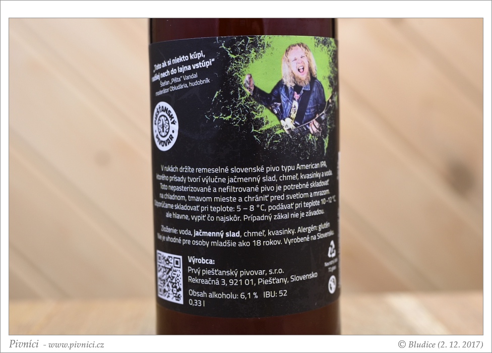Nedobré pivo s řadou vad, velmi špatně pitelné.Minimální trvanlivost: 19. ledna 2018